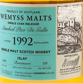 Nase: wunderbar balanciert zwischen dunklen süß-säuerlichen Sherrytönen und klassisch matschigem Bowmore-Rauch. Ein Potpourri aus vergorenem tropischen Obst, buttrige Papaya, Mango und Passionsfrucht mit leichter Säure. Aromatisches Zedernholz, Zigarrenta- bak und erwärmte Orientgewürze