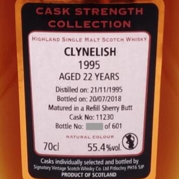 Nase: klassisch Clynelish - Honigwabe, Wachs, Vanilledrops und etwas Getreidebrei. Relativ süß: Zuckeraprikosen und frische grüne Elemente, auch etwas Heu. Weniger mineralisch als üblich und null alkoholisch.